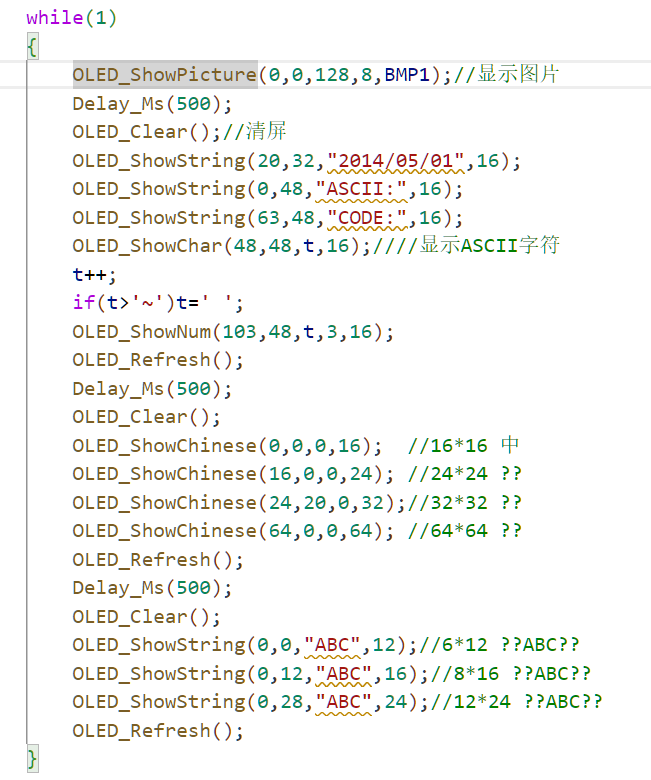 其中bmp.h是C语言数组,通过数组来显示oled屏(oled是每一个像素是一个发光点)。oled.c是主要是函数,oled.h主要是一些定义,在我看来是规范性的写法,oledfont.h是定义一些常用的字母符号显示。这几个不可以缺少。