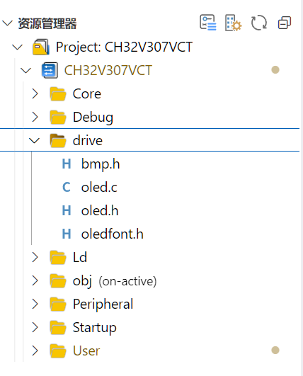 MounRiver Studio Ⅱ 中新建工程,选择对应芯片,在此工程目录下添加drive文件夹,把所有驱动文件加入其中。
